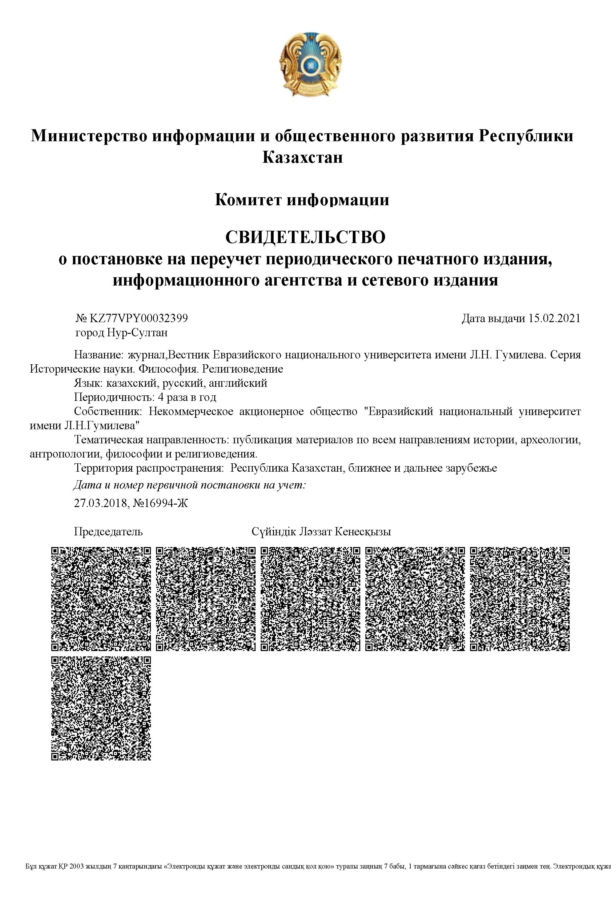 The journal "Bulletin of the L. Gumilyov ENU Series: Historical Sciences. Philosophy. Religious Studies" 1995 уе. is a peer–reviewed open access scientific journal that publishes original scientific works in all areas of theoretical and applied research in the field of subject, interdisciplinary and multidisciplinary fields of social and humanitarian sciences: history, archaeology, anthropology, political science, political history, philosophy, cultural studies, religious studies. The brand of the journal is an interdisciplinary and intersectoral synthesis combining unique thematic areas of social and humanitarian research.